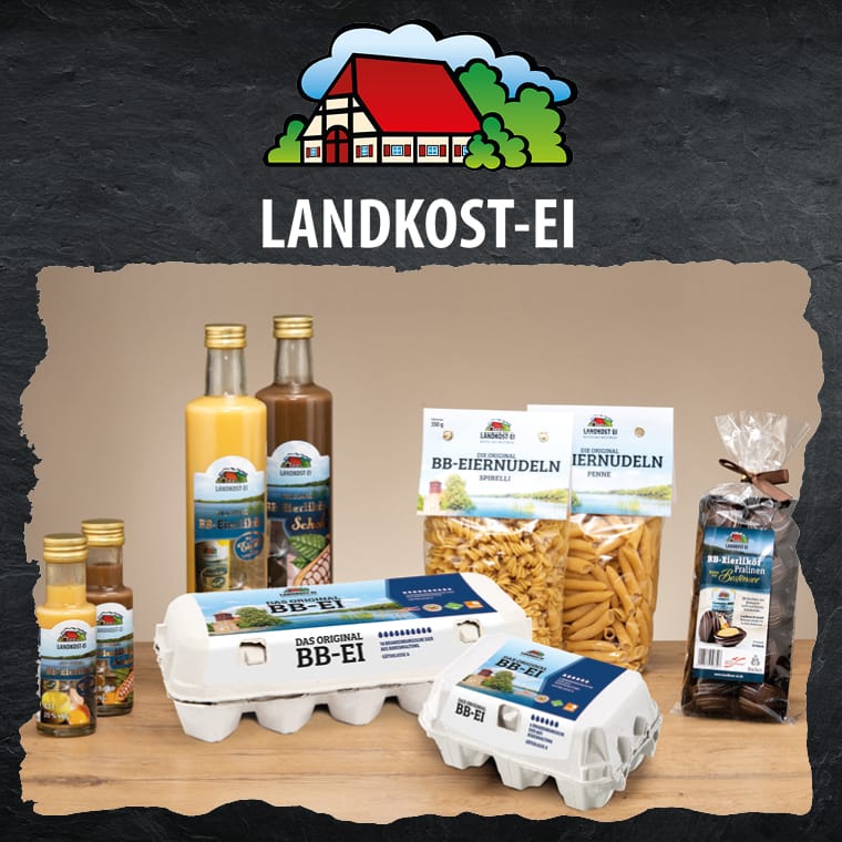Landkost-Ei – hinter dieser Marke stehen zwei Unternehmen, die stark miteinander verbunden sind. So kümmert sich die Spreenhagener Vermehrungsbetrieb für Legehennen GmbH um die artgerechte Aufzucht und Haltung der Legehennen. Die Landkost-Ei GmbH ist für die Vermarktung von frischen Eiern aller Haltungsformen zuständig. So dreht sich hier alles um die Hennen und vor allem um die Eier. Mit der Zeit wurde das Sortiment - in Zusammenarbeit mit Betrieben aus der direkten Nachbarschaft -, um Eierlikör oder auch Eiernudeln erweitert.