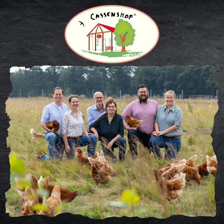 Der Cassenshof ist mehr als ein Ort. Geprägt von den Werten der Heimat Niedersachsen steht er für gelebte Familientradition im Wandel der Zeit. Mit Unterstützung eines Netzwerkes aus familiengeführten Partnerbetrieben produzieren Familie Voß und Familie Pelka beste Freiland- und Bio-Eier. Rund um den Stammbetrieb in Inzmühlen in der Lüneburger Heide und um den Betrieb im idyllischen Watzum im Braunschweiger Land versorgt der Cassenshof Ihre Region mit echten Landeiern.