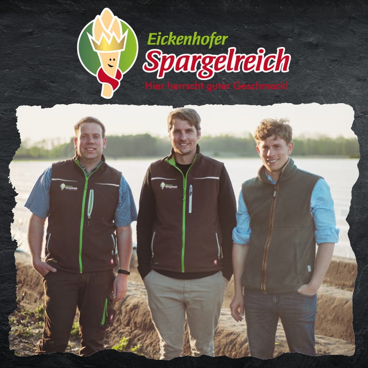 Seit 2007 wird das Eickenhofer Spargelreich in Eickhorst durch sechs Landwirtsfamilien betrieben. Drei von ihnen – Christian Hansen, Paul Schofer und Malte Isermeyer – kümmern sich um Anbau und Vermarktung des Spargels. Alle Familien haben bereits seit Generationen Erfahrung im Spargelanbau im Braunschweiger Land. Die junge Generation setzt darauf, die Tradition mit modernen Methoden und nachhaltigem Handeln fortzuführen. Ihr Ziel ist es, Eickenhofer Produkte stets mit der besten Qualität anzubieten und dabei immer offen für neue Ideen zu sein.