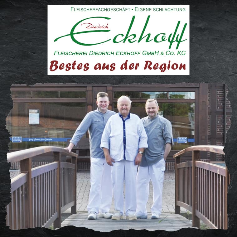 Die seit mehreren Generationen familiengeführte Fleischerei Eckhoff legt bereits seit Firmengründung größten Wert auf die Bewahrung der Handwerkstradition. Gepaart mit modernen Produktionstechniken ist es so stets ihr Anspruch, reine Lebensmittel in bester Qualität zu produzieren. Dabei sind bestes Futter, große prächtige Wiesen, größtmögliche Sorgfalt, Vertrauen und stets kurze Transportwege ein Garant für hochwertige Wurstwaren. Gemeinsam stehen sie für den respektvollen Umgang mit Mensch und Tier.