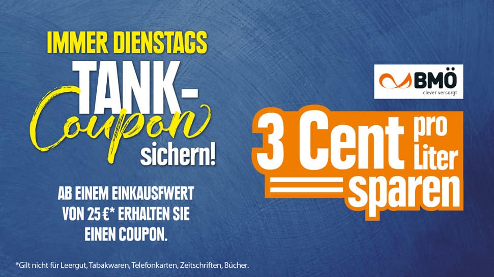 Jeden Dienstag erhalten Sie ab einem Einkaufswert von 25,- € einen Rabattcoupon von der BMÖ Tankstelle Weserpark. Mit diesem Coupon sparen Sie beim Tanken 3 ct pro Liter Kraftstoff.