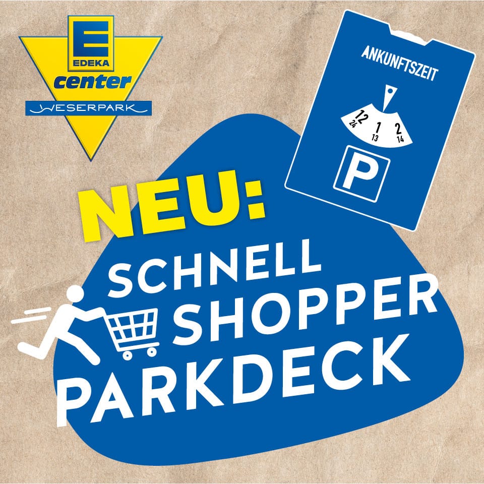 Parken Sie kostenlos auf über 500 Schnellshopper-Parkplätzen oben auf dem Weserpark-Einkaufszentrum Parkdeck (maximal 2 Stunden).