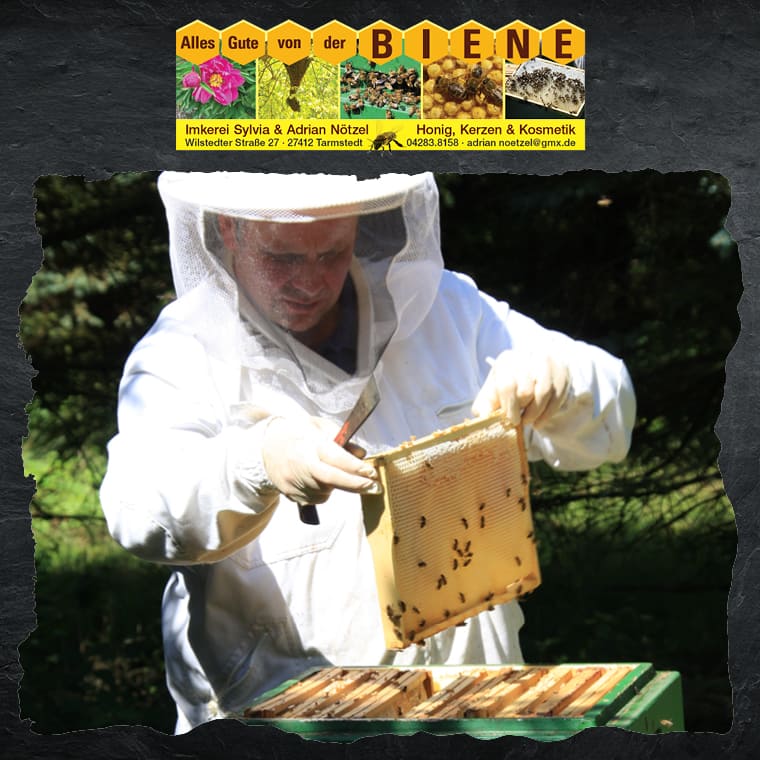 Schon in jungen Jahren wurde das Interesse für die Bienen in Adrian Nötzel geweckt und kurze Zeit später hatte er das erste eigene Bienenvolk. Der kleine Imkerei-Familienbetrieb ist nun seit fast 20 Jahren in Tarmstedt aktiv. Die Bienenvölker stehen im Umkreis von 20 Kilometern rund um den Ort. Für einige Honige wandern die Bienen nach Schleswig-Holstein und Brandenburg. Von der Honiggewinnung bis hin zur Abfüllung und Vermarktung wird alles mit Liebe selbst gemacht. Honig wird in cremiger und flüssiger Form von mildem bis kräftigem Geschmack angeboten.