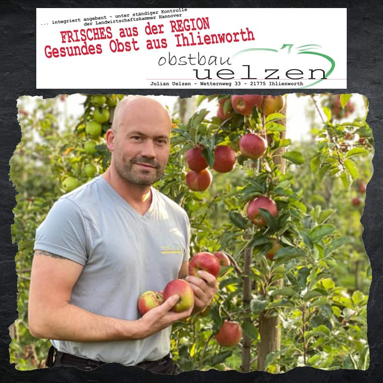 Großvater Herbert erbte den Viehhandel vom Urgroßvater. Dieser erkannte schnell seine Liebe zum Gemüseanbau und stellte den Hof dementsprechend um. Mit Pferd und Wagen, später mit dem Trecker, ging es zum Wochenmarkt nach Cuxhaven. Julians Vater Egon führte den Gemüsebetrieb fort und erweiterte die Produktion um Äpfel und Birnen. Julian Uelzen übernahm im Jahr 2000 den Hof in vierter Generation und fokussierte sich auf Äpfel, Birnen, Kirschen und Erdbeeren. Die Liebe zum Obstanbau ist bis heute ungebrochen und in vier Generationen gewachsen.