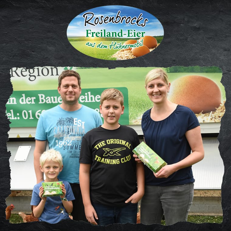 Bei Familie Rosenbrock aus Tarmstedt sind die Hühner mit ihrem Hühnermobil fast immer auf Reisen. Die Hühner verbringen viel Zeit an der frischen Luft und können tagsüber auf der Wiese nach Herzenslust picken und scharren. Durch das regelmäßige Umstellen des mobilen Hühnerstalles haben die Hühner immer wieder frisches Grün rund um ihr Zuhause. Es wird gentechnikfreies Futtermittel verfüttert. Die Hühner können ihre Freiheit in vollen Zügen genießen. Diese hohe Qualität spiegelt sich in den frischen Freilandeiern wider.