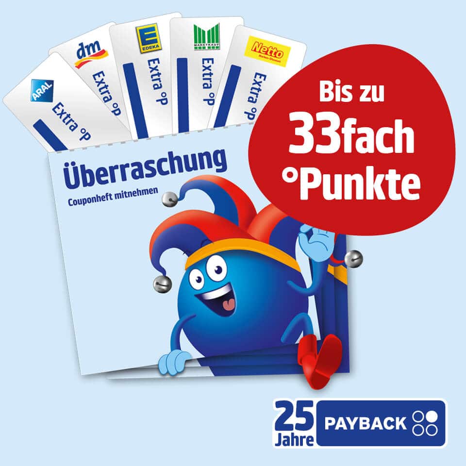 • zusätzlich in der PAYBACK App am Gewinnspiel teilnehmen und die Chance auf tolle Preise, °Punktegewinne und eCoupons sichern