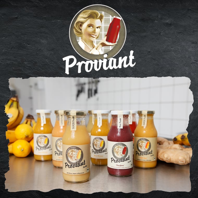 Angefangen hat alles im Jahr 2008. Drei Freunde aus der Schulzeit hatten den Plan, ein eigenes Café aufzumachen. Dafür verkauften sie »testweise« auf Berliner Straßenfesten Wraps, frisch gepresste Säfte und Smoothies. Die selbstgemachten Smoothies wurden ihnen regelrecht aus den Händen gerissen. Da ihr Plan mit dem eigenen Café nicht aufging, beschlossen sie: jetzt eben nur noch Smoothies. Seit 2009 mixen die drei Freunde in ihrer Fruchtmanufaktur Proviant in Berlin leckere Smoothies aus frischem Bio-Obst.