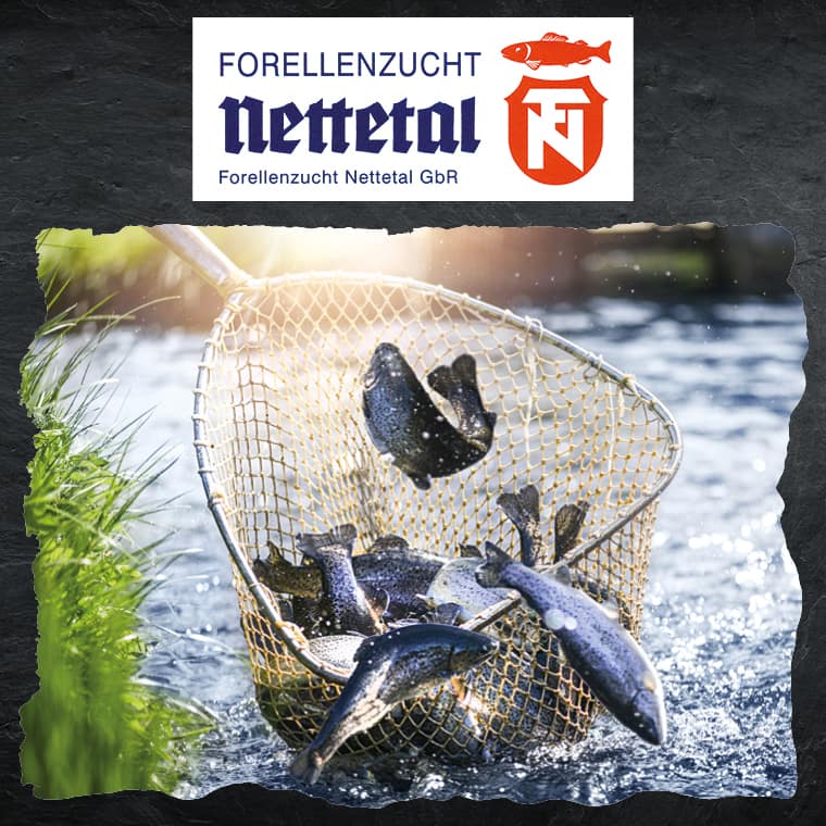 Der Familienbetrieb Forellenzucht Nettetal wurde 1933 gegründet und wird seit 1939 sogar als Meisterbetrieb geführt. So sind über 80 Jahre Fachkompetenz maßgeblich entscheidend für die hohe Qualität der sehr anspruchsvollen Forellen, Lachsforellen und Saiblinge. Die Fische werden ausschließlich lebend frisch direkt aus dem Brunnenwasser verarbeitet – Frischer geht es nicht! In aufwendiger Handarbeit werden die Fische anschließend über Buchenholz geräuchert und garantieren so ein echtes Genusserlebnis.
