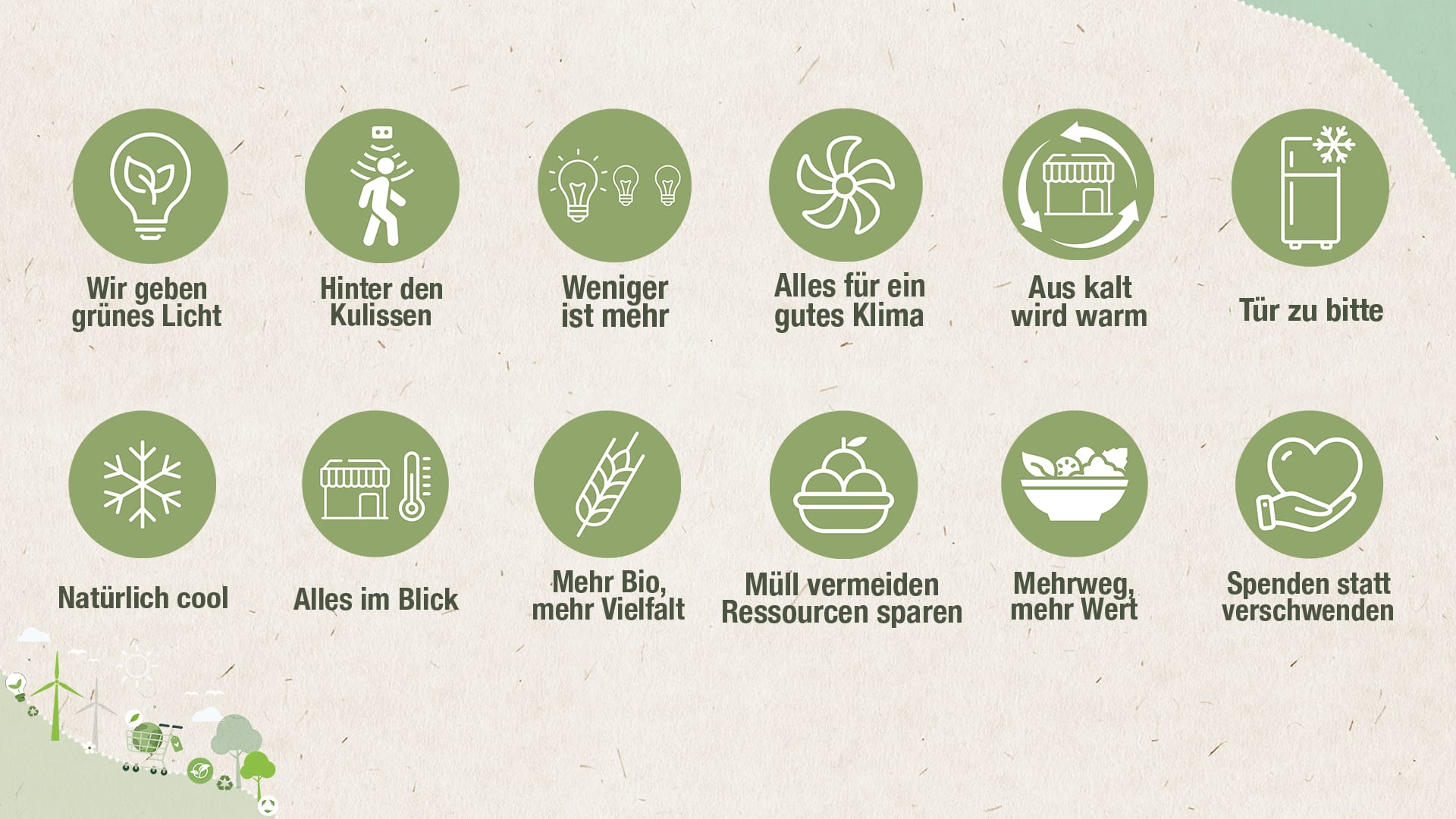 Die Beleuchtung unseres Marktes wollen wir rundum optimieren. Unsere Nebenbereiche sind mit Präsenzmeldern ausgestattet, die dafür sorgen, dass nur Energie verbraucht wird, wenn wir sie benötigen.