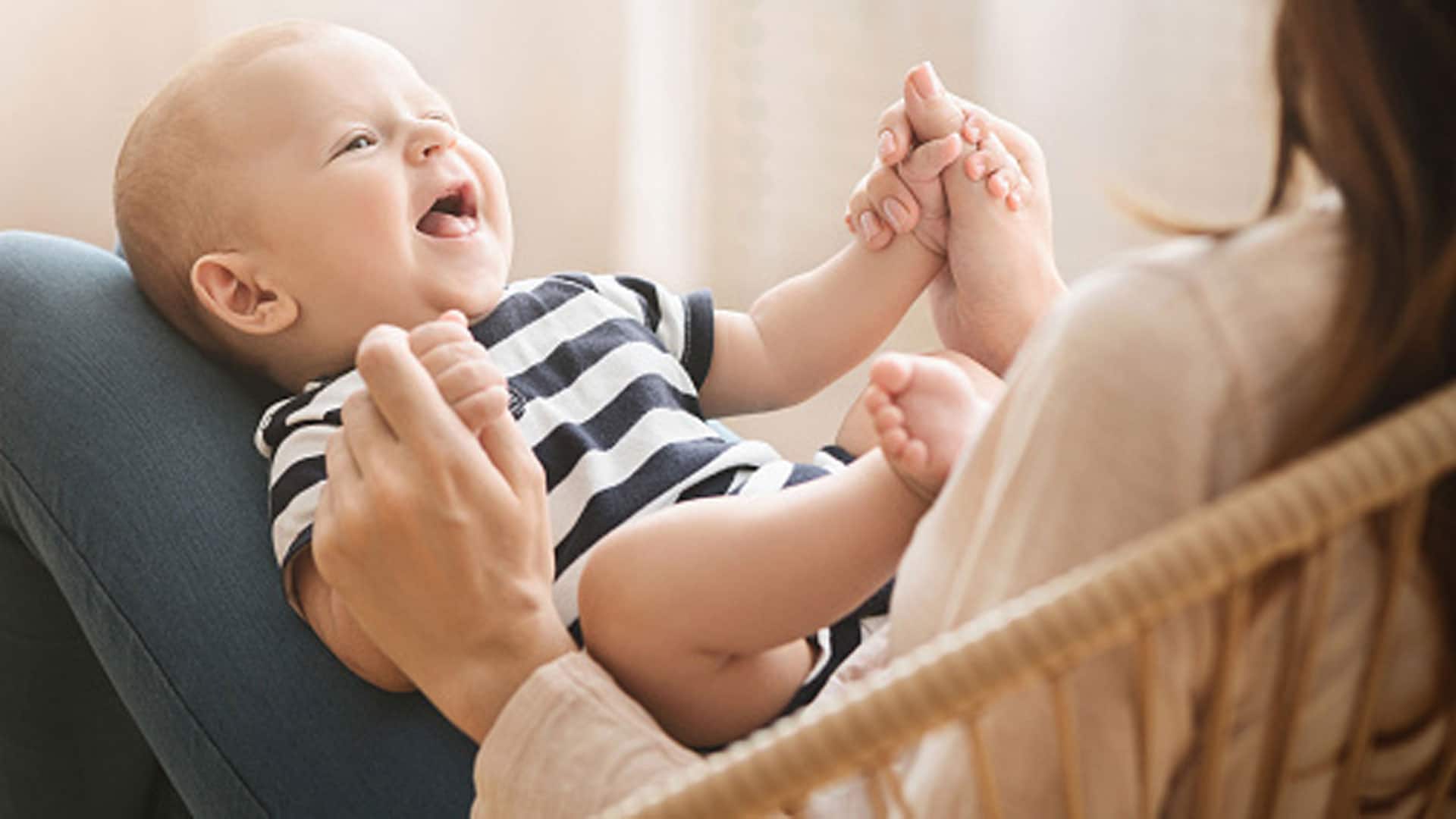 Wenn dein Baby am Anfang übrigens eines nicht kann, dann ist das lächeln. In der ersten Wochen zeigt sich – vor allem im Schlaf – nur das sogenannte Engelslächeln. Es handelt sich um eine Muskelbewegung: Das Baby lächelt nicht bewusst. Das soziale Lächeln stellt sich mit etwa zwei Monaten ein. Aber ab wann lachen Babys bewusst? Das dauert circa vier bis fünf Monate. Dann kannst du dich auf lautes, glucksendes Lachen freuen – das aus tiefsten Kinderherzen kommt.