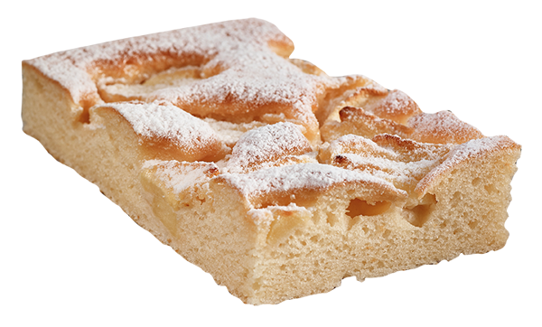 saftiger mit Joghurt verfeinerter Rührkuchenteig mit Apfelspalten und Puderzucker dekoriert, Familienstück