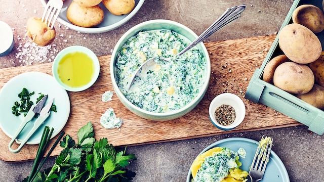 Sie stehen in Ihrem Garten vor einer üppigen Schnittlauchernte oder haben nach dem Kochen noch reichlich Reste des Lauchgewächses übrig? Dann nutzen Sie unsere verschiedenen Schnittlauch-Gerichte sowie tolle Anregungen, wie Sie das beliebte Kraut in der Küche verwenden können – etwa für einen deftigen Kartoffelkas. Schnittlauch gehört zu den klassischen Küchenkräutern und zu den "fines herbes", den feinen Kräutern der französischen Küche. Er schmeckt kräftiger und würziger als andere Laucharten, aber nicht so intensiv wie Zwiebeln oder Knoblauch, die zur selben Familie gehören. Dennoch benötigen Sie zum Würzen keine großen Mengen. Je feiner Sie die Halme schneiden, desto intensiver wird das Aroma. Unser Green Goddess Salad zeigt, dass Schnittlauch hervorragend zu den verschiedensten Salat-Rezepten passt. Frisch über den Salat gestreut oder als Bestandteil des Salatdressings schmeckt Schnittlauch ebenso wie als Topping auf einer mit Frischkäse oder Butter bestrichenen Scheibe Brot. Hart gekochte Eier, Rührei oder Eiersalat lieben eine Dekoration mit den zarten grünen Halmen. Auch Kartoffelgerichte, Suppen und Soßen können Sie vor dem Servieren damit bestreuen und hübsch anrichten.