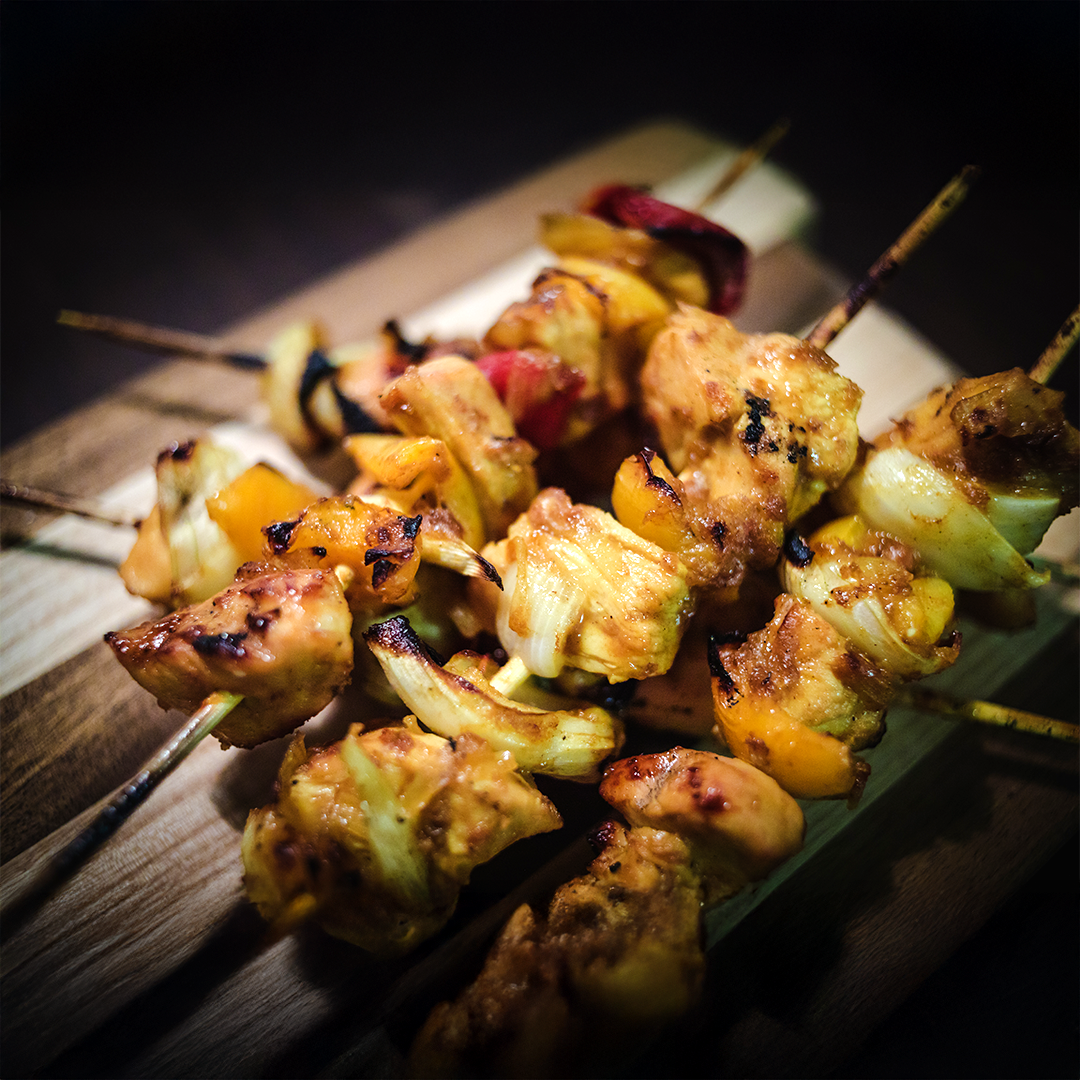 Das Fleisch in mundgerechte Stücke schneiden, mit der Marinade bestreichen und über Nacht ziehen lassen.