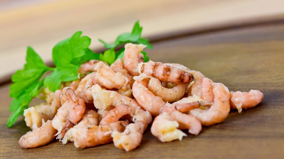 Für die Krabben nun Butter in einer weiteren Pfanne zerlassen und die Nordseekrabben erhitzen. Salz, Pfeffer und einen Spritzer Zitronensaft beigeben und anschließend mit dem Rührei servieren.