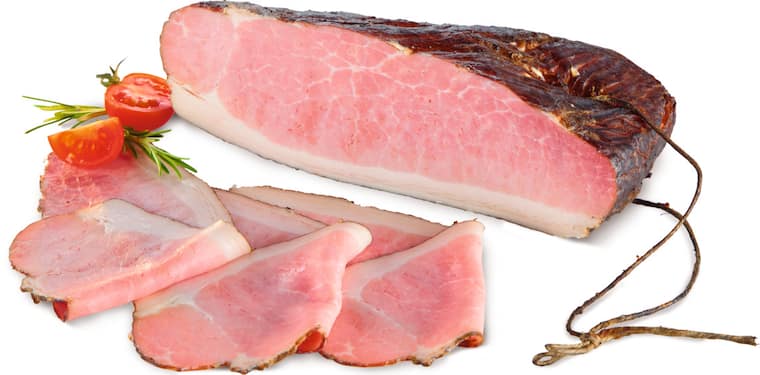 vom Schweinerücken, natur, am Stück auch in Scheiben natur erhältlich, 100 g = 1,19 € (auch in gewürzt erhältlich, 100 g = 1,29 €), 100 g
