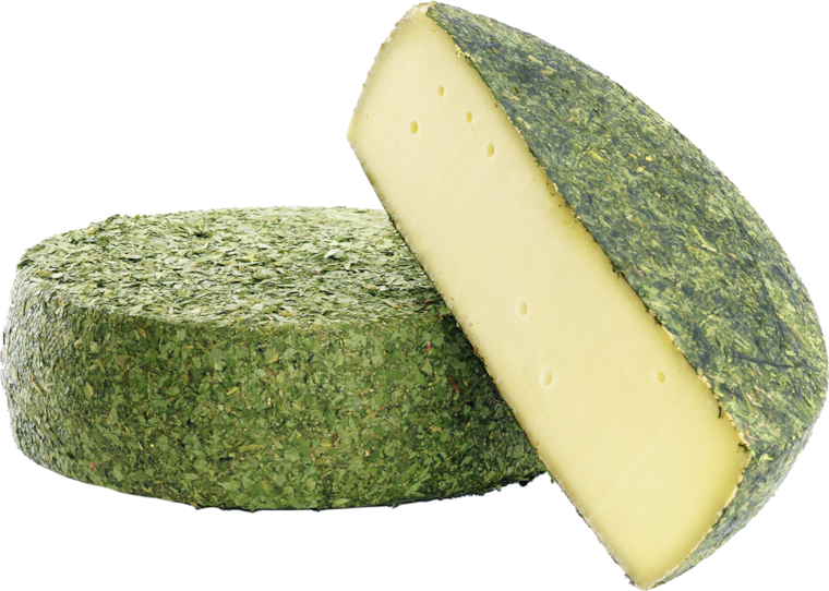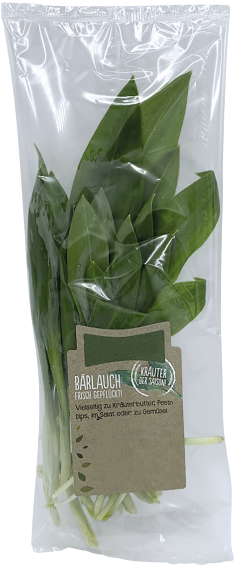 deutscher Schnittkäse 50 % Fett i. Tr., Rinde mit Bärlauch bedeckt, 4 Monate unter ständiger Pflege mit Bärlauch gereift, strohgelber Teig mit aromatischer Knoblauchnote, 100 g
