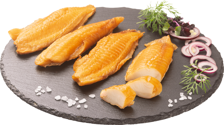 aus Tilapia, nach Art der Schillerlocke heißgeräuchert, 100 g