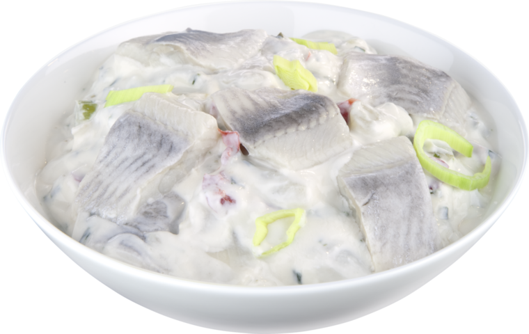 Heringsfilethappen mit Paprika, Staudensellerie und Gewürzgurken, in einem pikanten Joghurt-Sahne-Dressing, 100 g