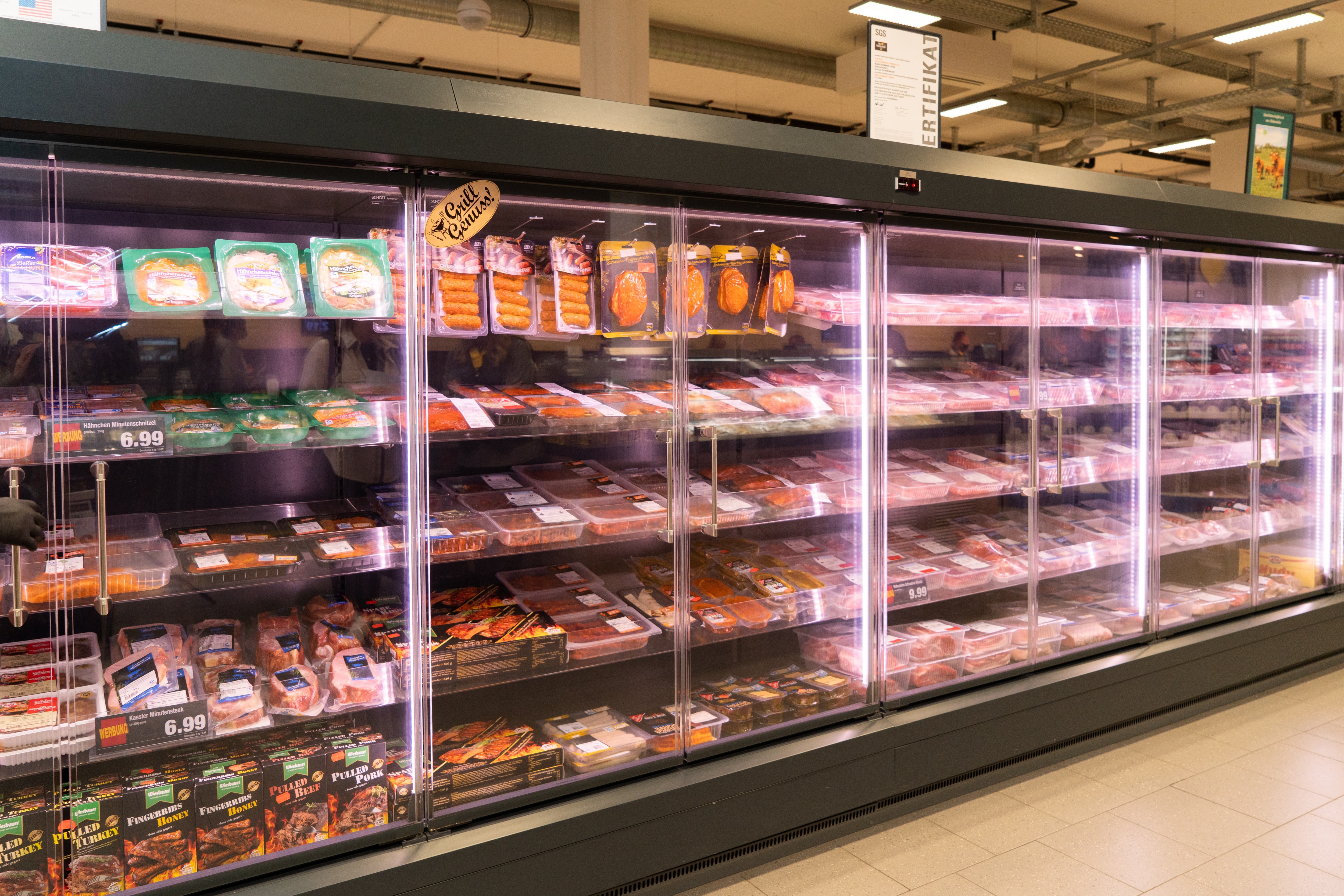 Die Bedientheke besteht aus der heißen Theke, der Wurst-, Käse- und Fisch-Theke. Fleisch finden unsere Kunden im Selbstbedienungsbereich, wobei wir hier täglich frische Produkte selbst veredeln, wie etwa Hackfleisch oder Grillspezialitäten, die dann abgepackt für dich bereitstehen. Wir veredeln ebenso für dich verschiedene Käseaufstriche, wie Obazda, Kochkäse oder Lachsaufstrich.