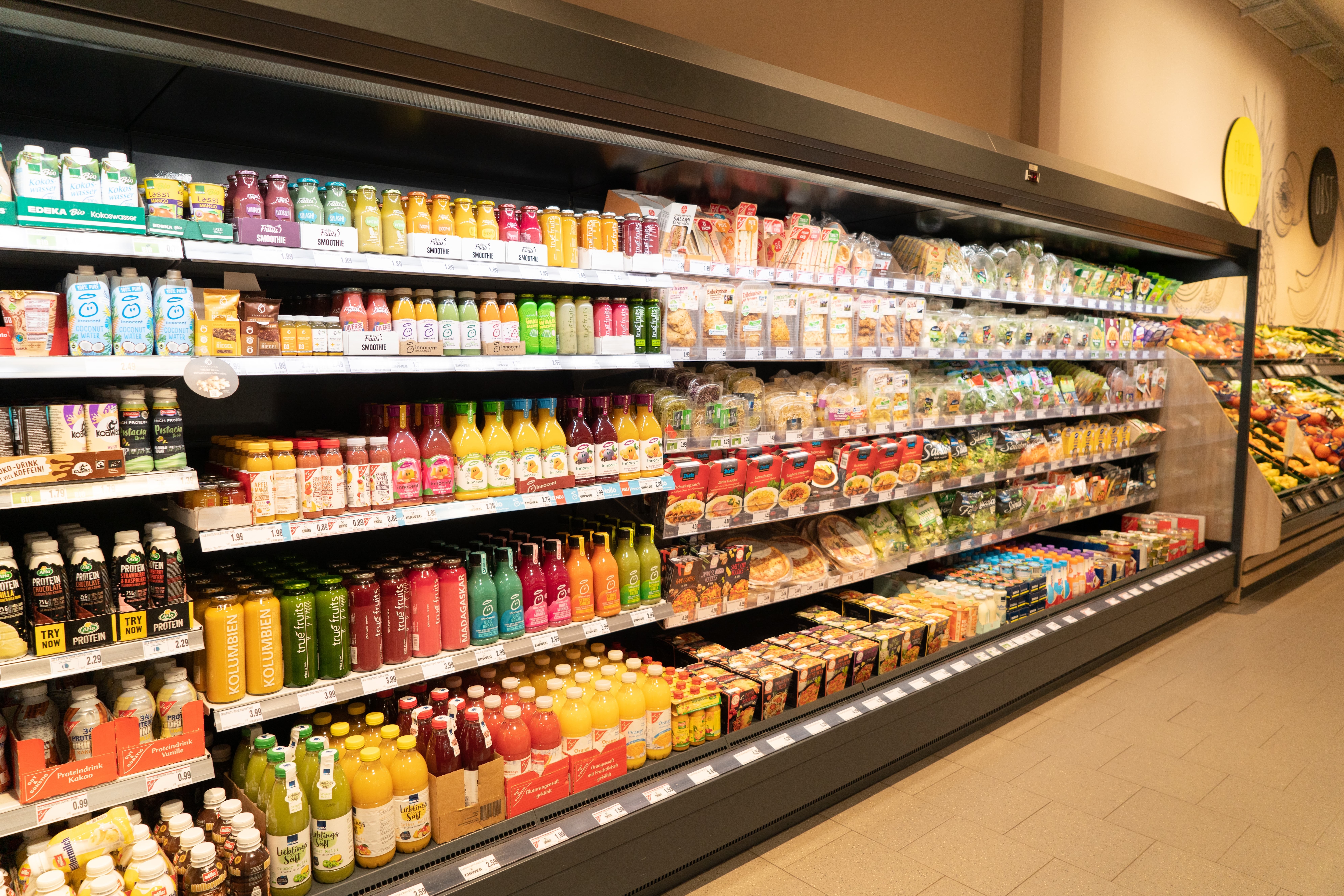 Neben Wraps, Sandwiches, abgepackte Baguettes, Nudelboxen, fertige Menüteller für die Mikrowelle beinhaltet unser Angebot auch Milchmischgetränke, Smoothies und gekühlten Kaffee. Und ganz NEU: täglich frisches Sushi angeboten von der Firma Sushi-Circle. Diese Produkte sind ganz schnell und einfach in unserem Eingangsbereich zu finden und die Kunden gelangen ebenso zügig an die Kassen.