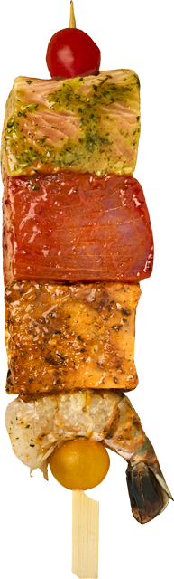 Thunfisch, Lachs, Schwertfisch und Garnele, verschieden mariniert, aus eigener Herstellung, 100 g