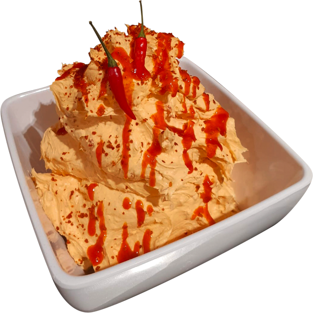 deutscher Frischkäse, mind. 60% Fett i. Tr., pikant verfeinert mit Chilisauce und Sambal Oelek, aus eigener Herstellung, 100 g