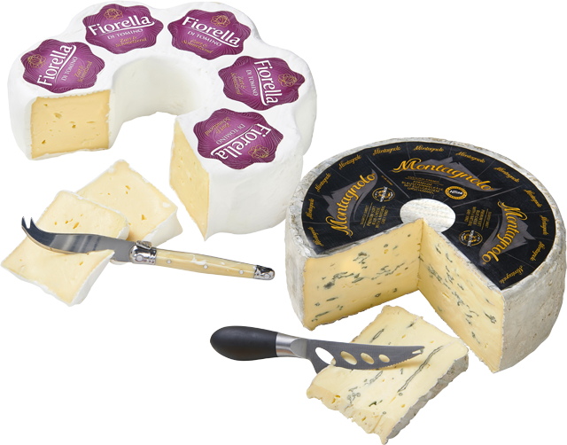 mind. 70% Fett i. Tr., mit Blauschimmel oder Fiorella di Tomino Torte, mind. 68% Fett i. Tr., mit Weißschimmel überwachsen, deutscher Weichkäse, 100 g