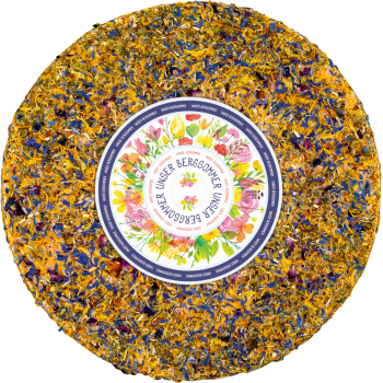 deutscher Schnittkäse, mit Ringelblumen, Kornblumen und Rosenblüten auf der Rinde affiniert, 50% Fett i. Tr., je 100 g am Stück