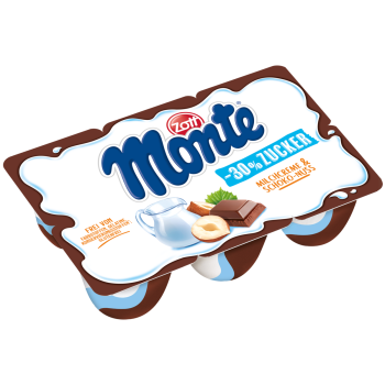 -30% Zucker oder Schoko auch Zott Monte Drink Schoko 4 x 95 ml im Angebot, je 6 x 55 g = 330 g Packung, (1 kg = € 4.55)
