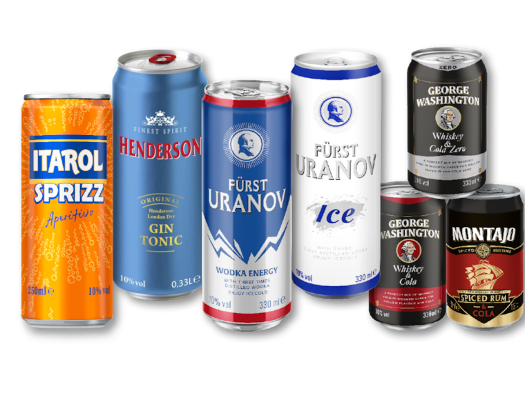 Henderson Gin Tonic, Fürst Uranov Ice, George Washington Whiskey & Cola, Montajo Rum & Cola, Itarol Sprizz und weitere Sorten, 10% Vol., 0,33 l / 0,25 l Dose (1 l = € 3.36 / € 4.44) zzgl. € 0.25 Pfand, Dose