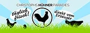 Christophs Hühnerparadies: Das bedeutet immer leckere, frische Eier direkt vom Jungbauer. Die glücklichen Hühner haben im Hühnermobil immer Auslauf und frisches Gras. Es ist wie ein Paradies für Hühner. Vor nun sieben Jahren hatte Jungbauer Christoph Sürig die Idee mit den mobilen Hühnerställen und ist auch heute noch »Feuer und Flamme«. Eine andere Haltung der Hühner kommt für ihn auf keinen Fall mehr in Frage. Die Haltung im Hühnermobil ist artgerecht und die Hühner werden sogar doppelt so alt.