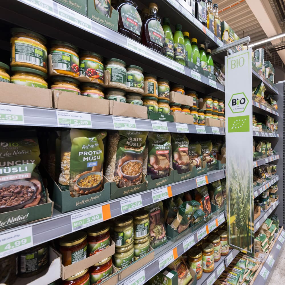 • In unserem Bio-Regal findet ihr ein breites Spektrum an Bio-Produkten diverser Marken