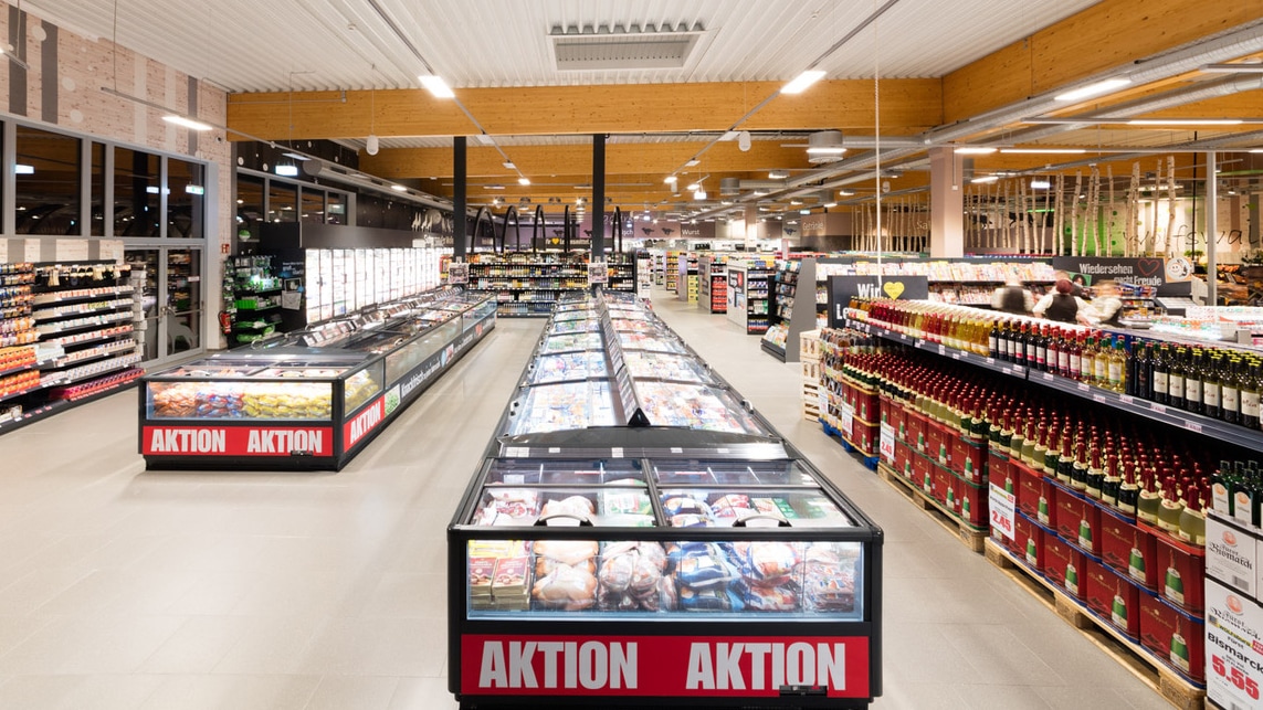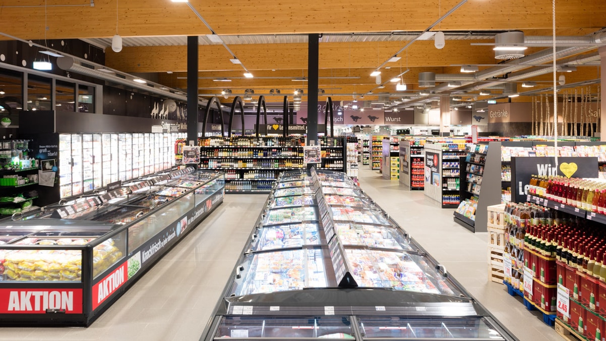 Zum Beispiel senkt die Betonkerntemperierung mit der Wärmerückgewinnung den Energieverbrauch: Dabei wird der Markt mit der Abwärme aus den Kälteanlagen beheizt. Im Bereich der Tiefkühl, Frische- und Molkereiprodukte arbeiten moderne, mit Glastüren zu schließende Kühlmöbel der Atmosphäre zuliebe mit dem natürlichen Kältemittel CO2. Der Supermarkt wird zu 100 Prozent mit energiesparenden LED beleuchtet.