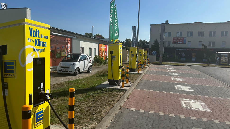 Lade dein e-Fahrzeug an einer unserer fünf Ladesäulen mit 10 Ladepunkten auf, während du bei uns im Markt einkaufen.