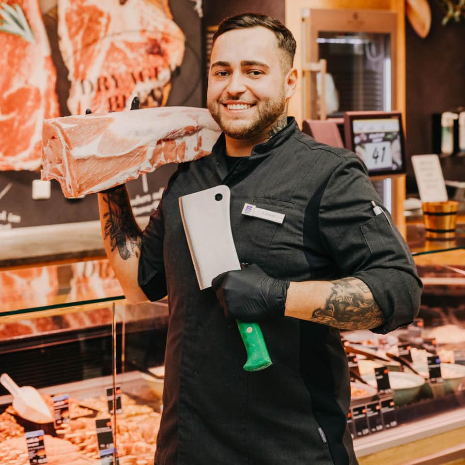 Abteilungsleiter der Bedientheke Fleisch & Wurst. Unser angehender Fleischermeister Tobias Brauer glänzt mit seinem großen Know How und berät Sie gerne. -