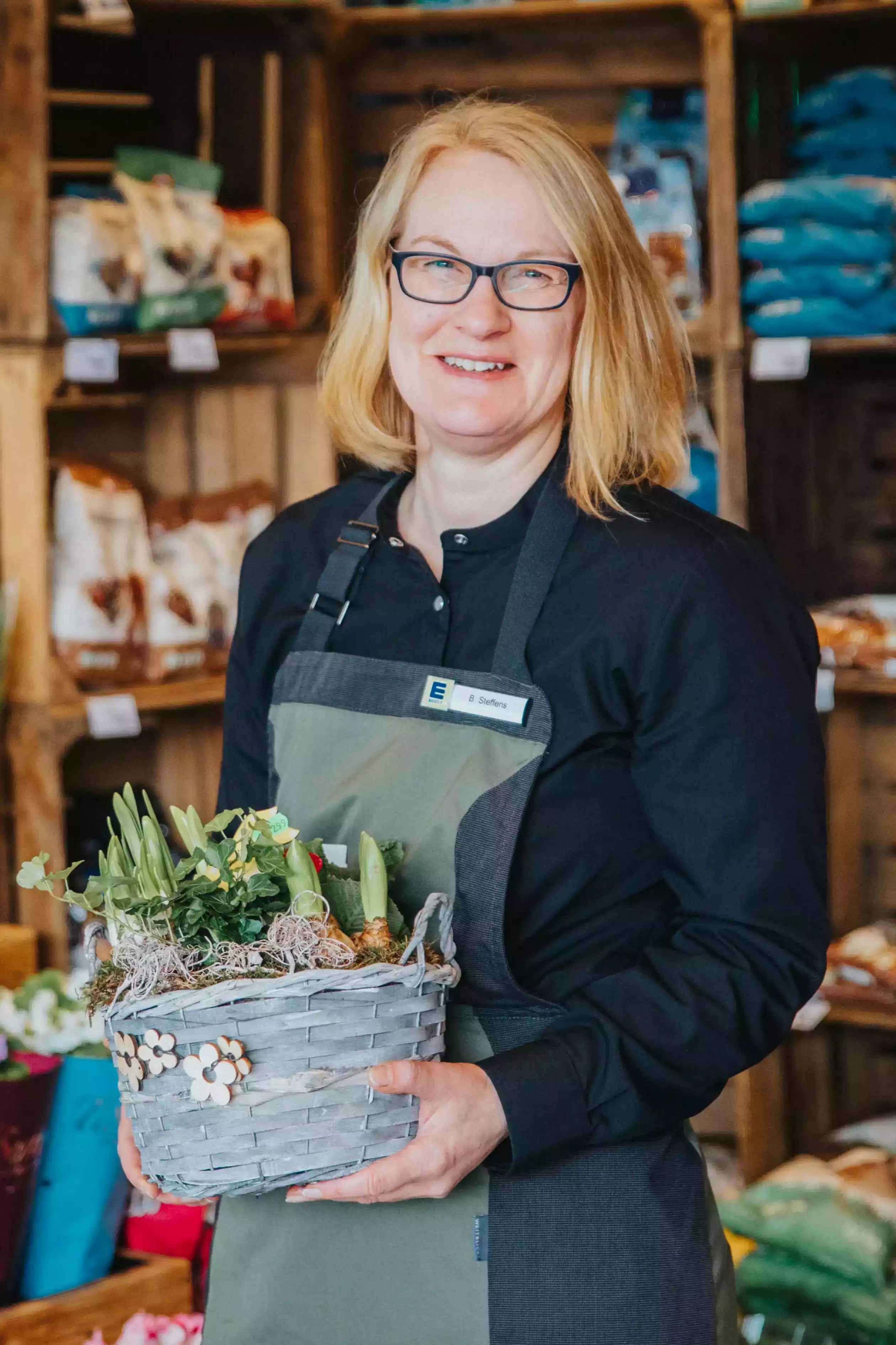 Britta Steffens verantwortlich für das Blumensortiment. In unserem Markt finden Sie eine Auswahl an Blumen für drinnen und draußen sowie Blumenarrangements und Blumensträuße zum Verschenken. Britta Steffens steht Ihnen gerne mit Rat und Tat zur Seite. -