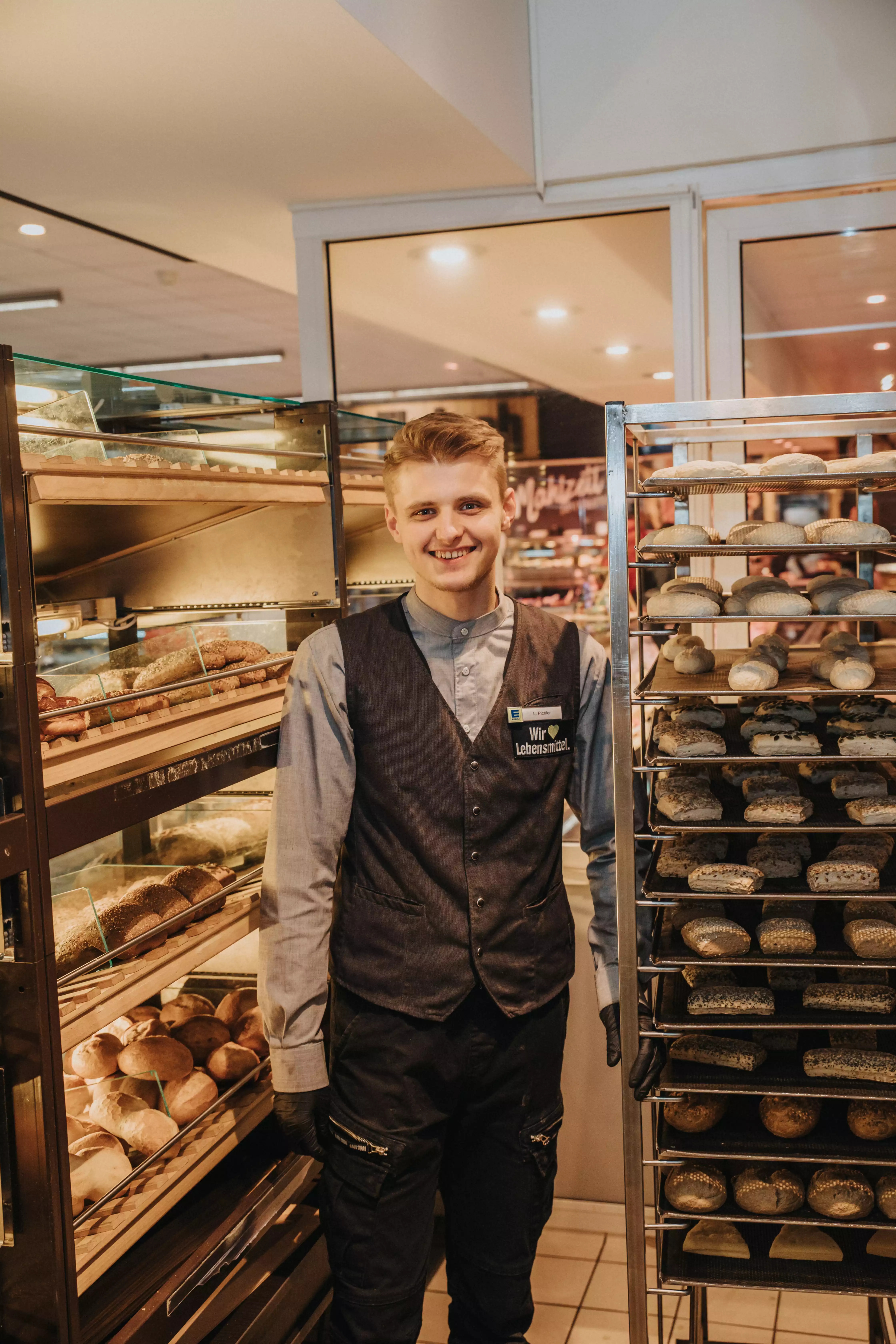 Leon Pichler ist Abteilungsleiter unserer SB-Marktbäckerei. Wenn es köstlich duftet hat Leon Pichler leckere Backwaren für Sie zubereitet. -