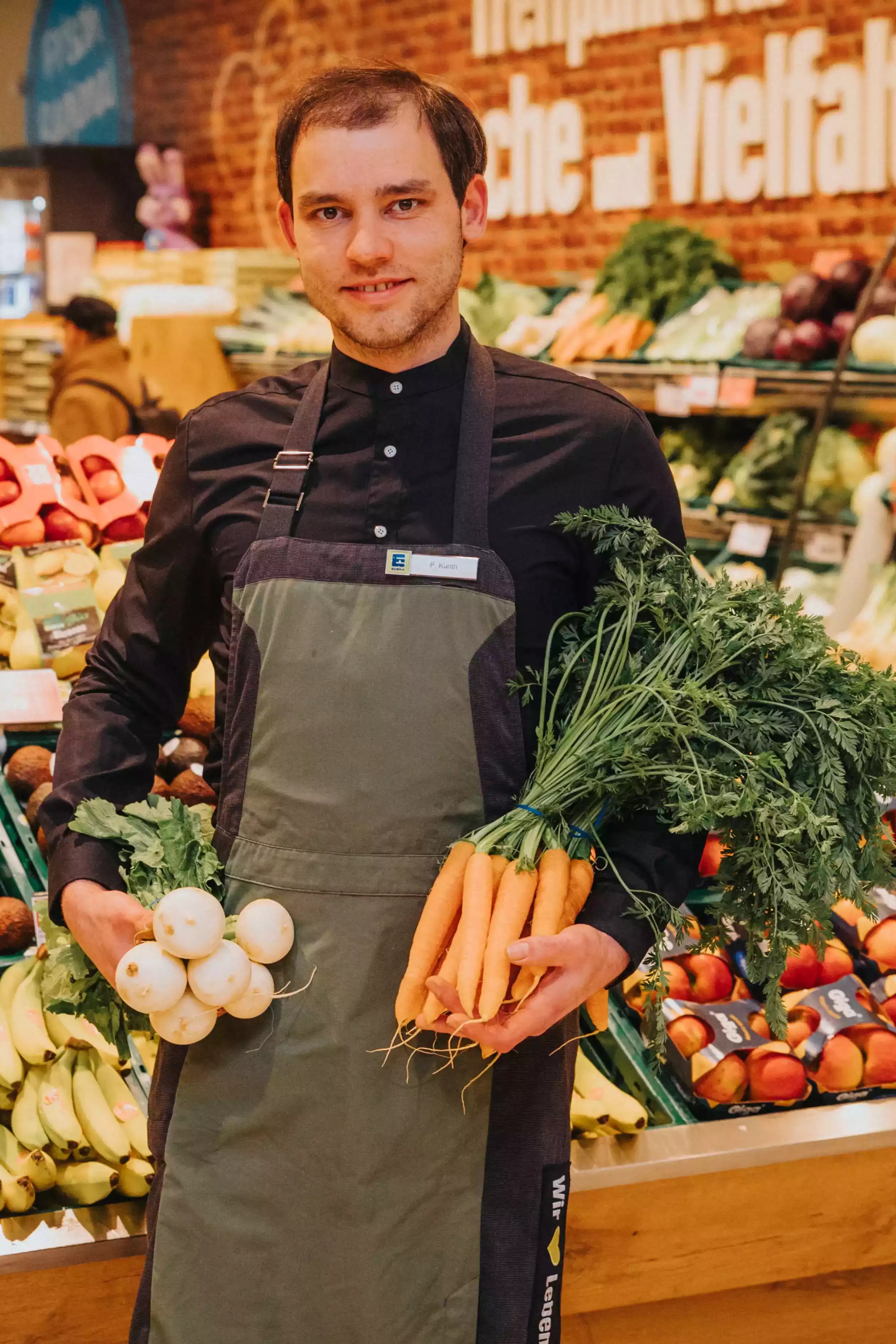 Abteilungsleiter Obst & Gemüse Phillip Kunth. Apfel, Birne, Tomate oder doch was exotisches? - Phillip Kunth kennt sich in diesem vielfältigen Sortiment bestens aus und steht Ihnen gerne mit Rat & Tat zur Seite. -