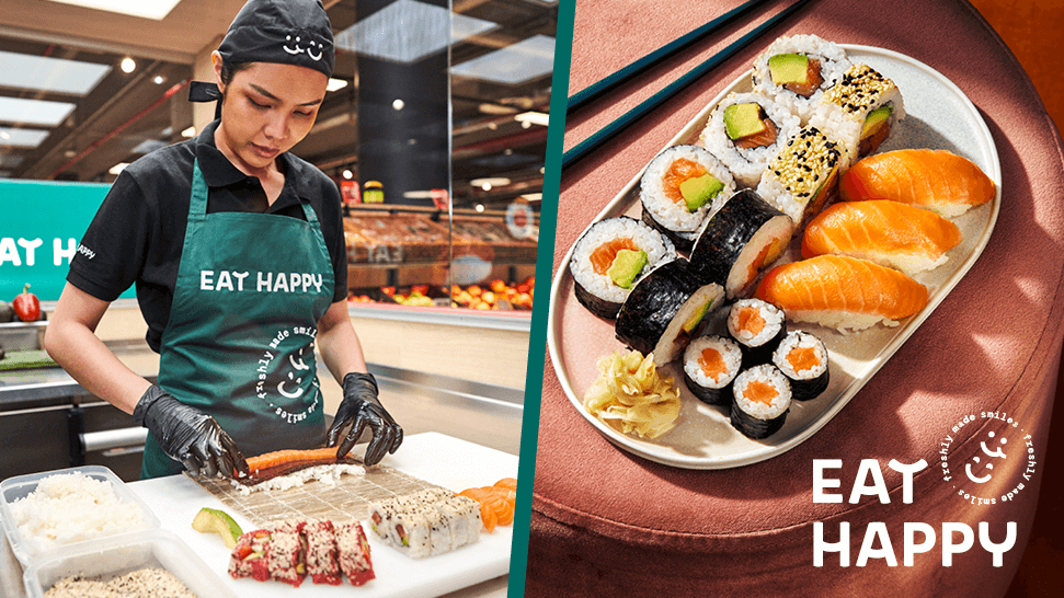 EAT HAPPY steht für handgerolltes Sushi und viele weitere asiatische Spezialitäten. Täglich frisch und liebevoll direkt im Markt für dich zubereitet.