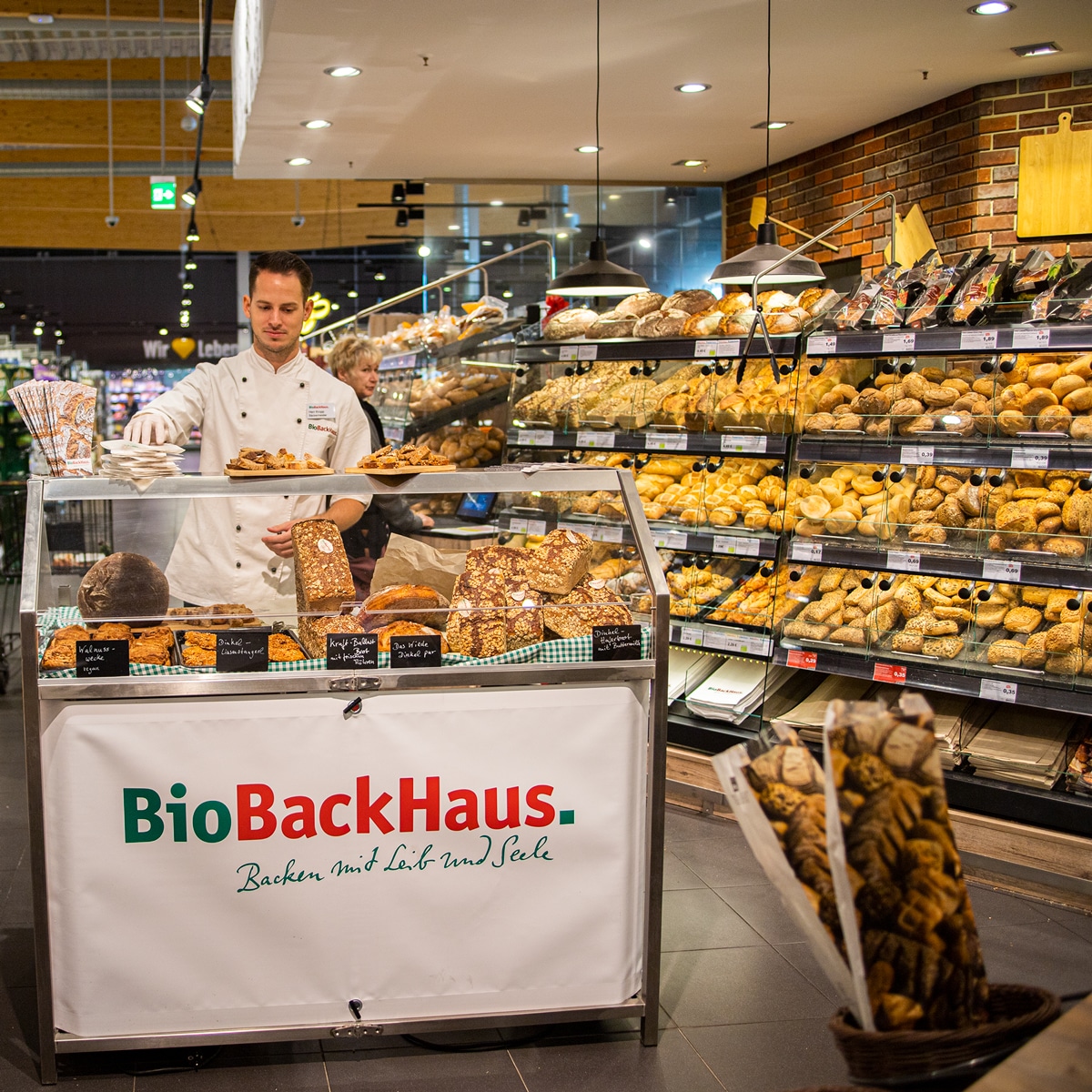 An unserer Backstation im Markt finden Sie täglich frische Brote und Brötchen sowie süße und herzhafte Snacks des regionalen Bio-Bäckers „BioBackhaus“ aus Wustermark. Auf Grund der Nachfrage an Bio-Artikeln – nicht nur im Backsortiment – bieten wir unseren Kunden ab sofort qualifizierte Biobackwaren an, auch vegan.