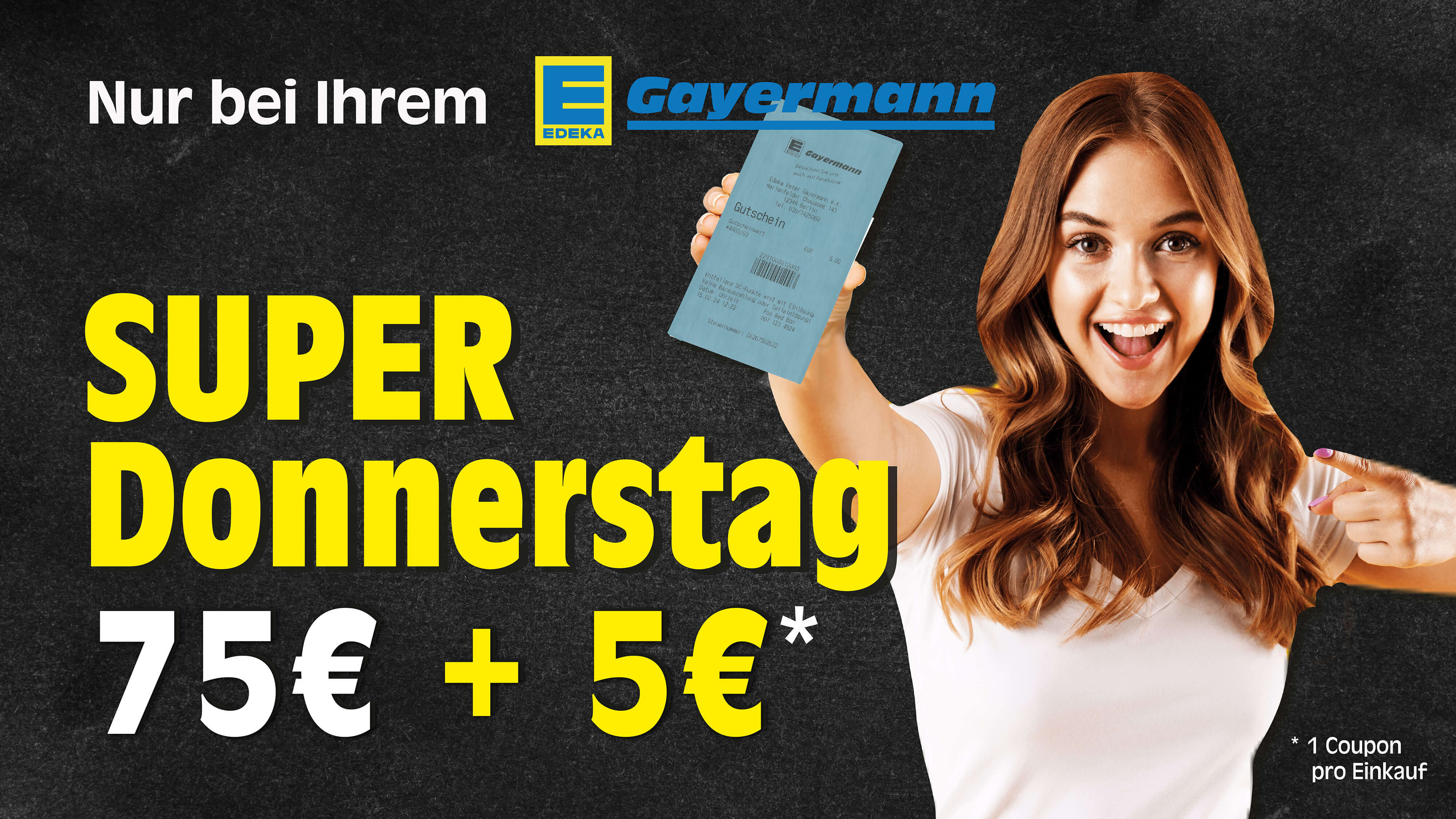 Jeden Donnerstag erhältst du bei einem Einkaufswert ab 75€ einen Rabattcoupon* im Wert von 5€ für den nächsten Einkauf.