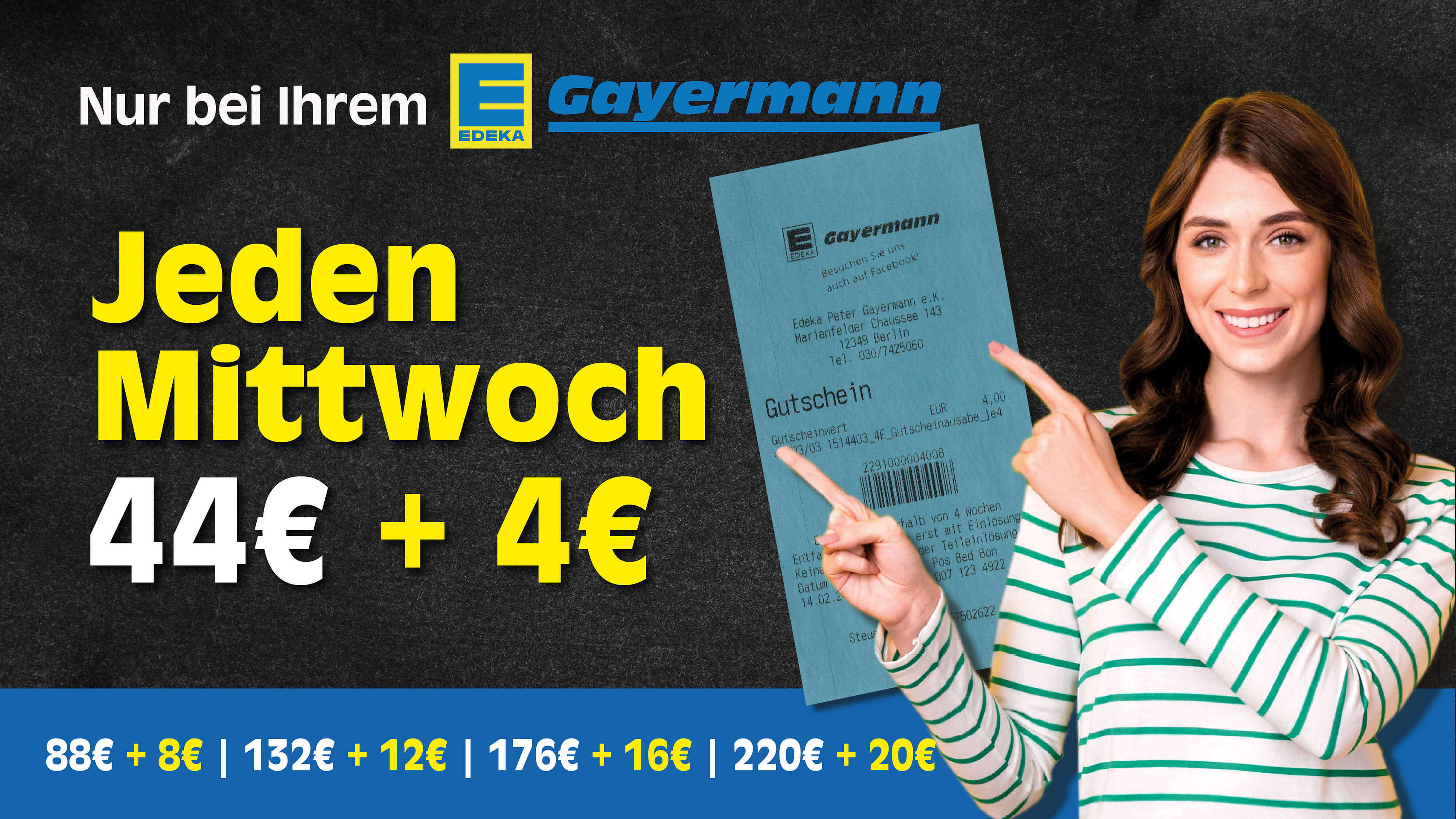 Bei einem Einkaufswert ab 44€ erhältst du jeden Mittwoch einen entsprechenden Rabattcoupon* für den nächsten Einkauf.