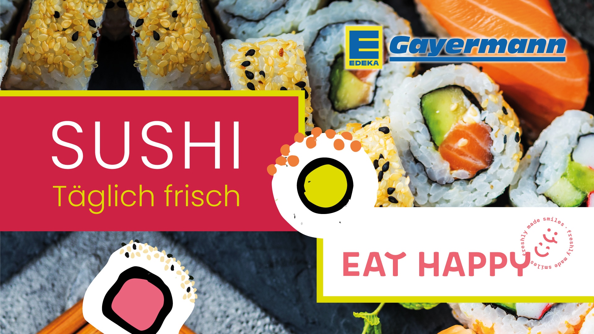 Von täglich handgerollten Sushi-Klassikern bis hin zu Bowls, Snacks und traditionellen Desserts. Eine bunte Auswahl der Produkte findest du in den EAT HAPPY Kühltruhen unserer Märkte.