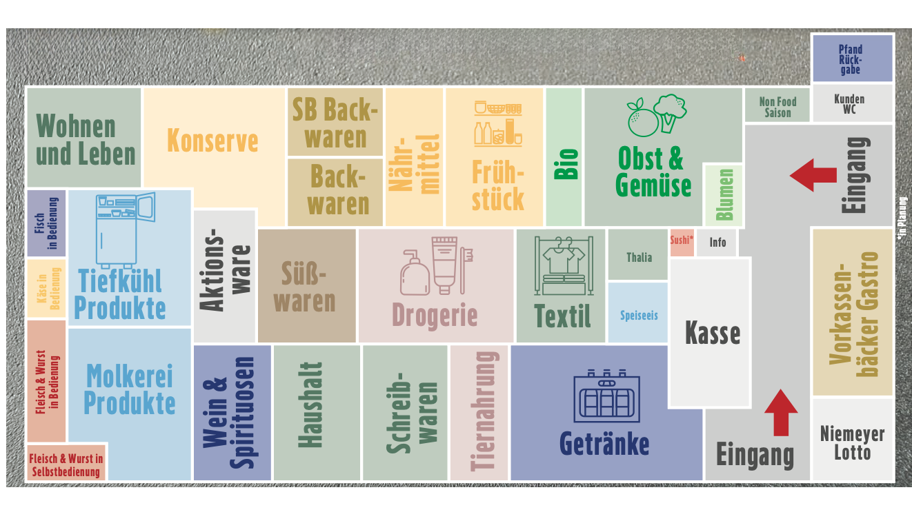 Wirf doch mal einen Blick in unseren Marktplan und verschaff dir einen Überblick, wo du welches Sortiment findest.