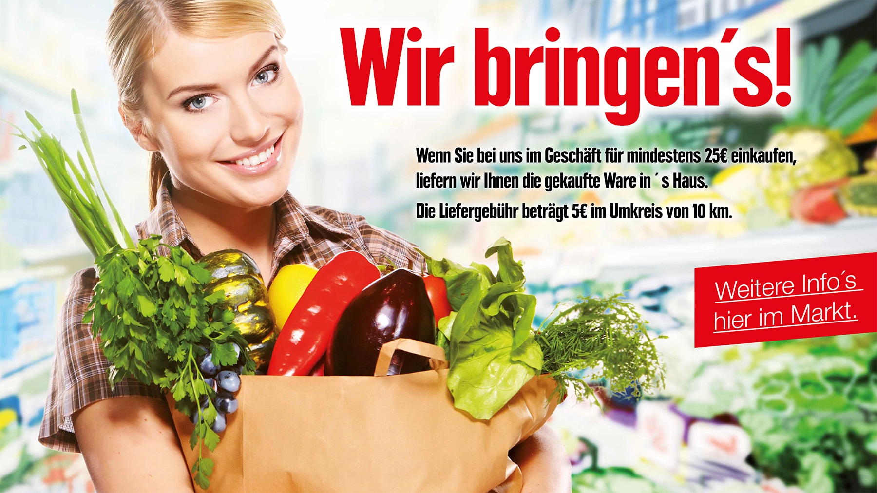 Wir versorgen euch mit frischen Lebensmitteln, besonderen Leckereien, regionalen Spezialitäten und allem für den täglichen Bedarf. Mit unserem modernen Supermarkt mit einer Verkaufsfläche von 1680m² bieten wir euch jeden Tag tolle Angebote und Aktionen. Überzeugt euch von unser Frische, Qualität, Produktvielfalt und Service. Unsere motivierten und freundliche Mitarbeiter gehen direkt auf eure Wünsche ein und beraten euch gerne! Sprecht uns an. Wir freuen uns auf euch!