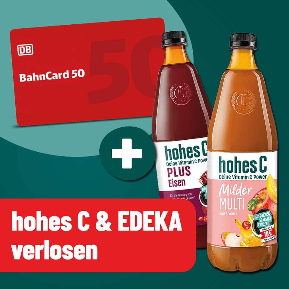 EDEKA & hohes C verlosen gemeinsam 20 x 1 BahnCard 50. Zusätzlich gibt es pro Aktionsflasche je einen Gutschein-Code im Deckel für einen 10 € Bahn Gutschein. Dieser Kauf lohnt sich!