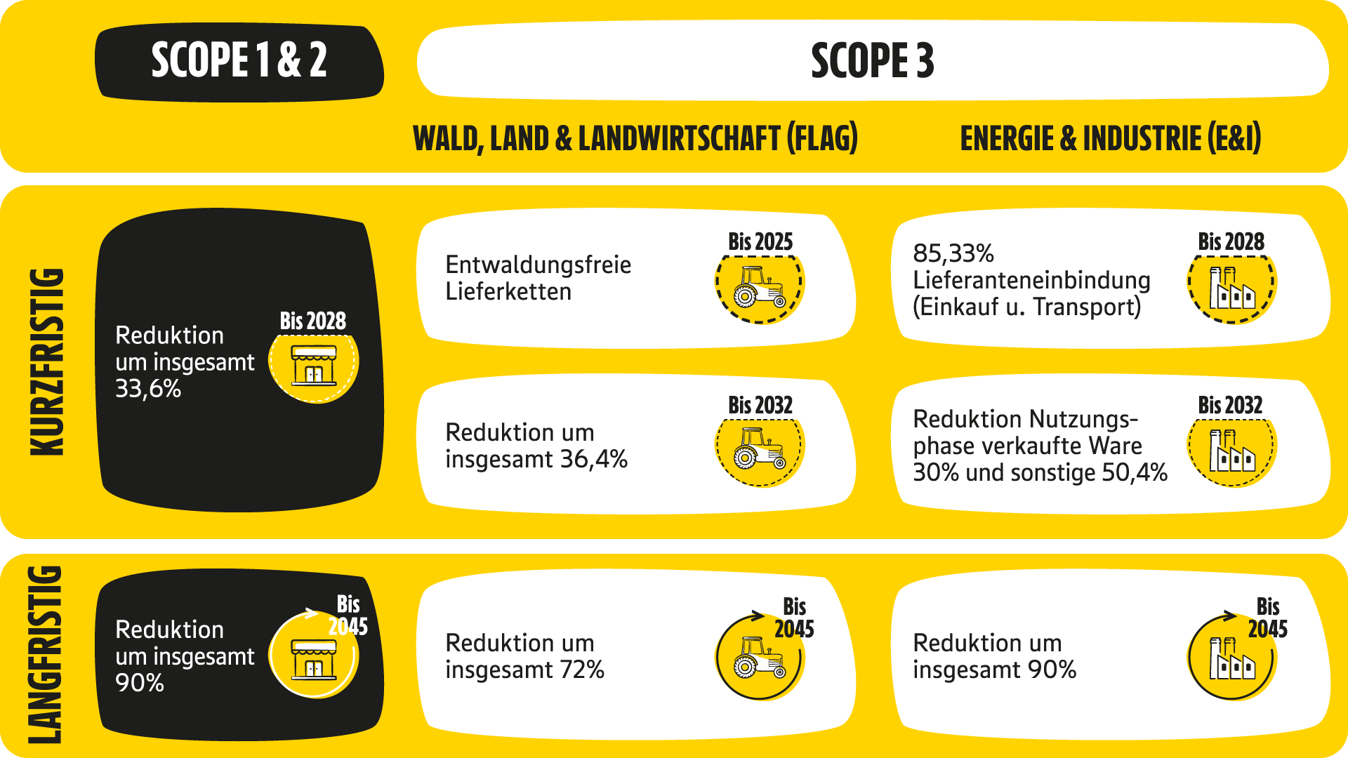 Das zweite Ziel ist langfristig angelegt und sieht vor, die Scope 1 und Scope 2 Emissionen bis zum Jahr 2045, um insgesamt 90% zu reduzieren. Dieses ambitionierte Ziel soll durch die vollständige Umstellung auf Grünstrom, den Einsatz von Biogas, die Elektrifizierung aller Transportmittel und die konsequente Nutzung emissionsarmer Technologien erreicht werden.