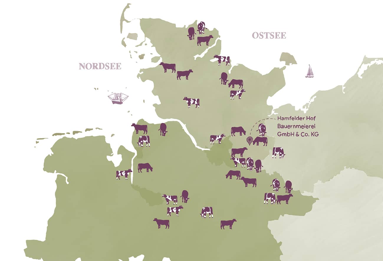 Die Rohstoffe für unsere Produkte stammen ausschließlich von den Bioland-Höfen unserer Bauerngemeinschaft. Alle unsere Höfe sind maximal 155 Kilometer von der Hamfelder Hof Bauernmeierei in Mühlenrade entfernt. Um unsere regionale Milch und unseren regionalen Haferdrink auch regional zu verkaufen, konzentrieren wir uns mit unserer Vermarktung auf Norddeutschland. Dadurch sind die Wege kurz – sowohl vom Erzeuger als auch zum Verbraucher.