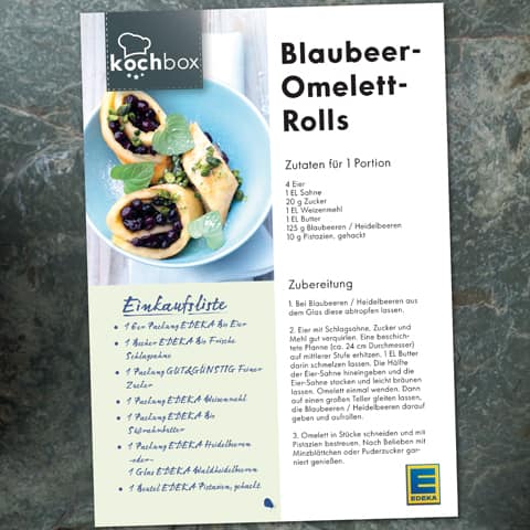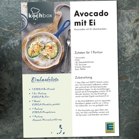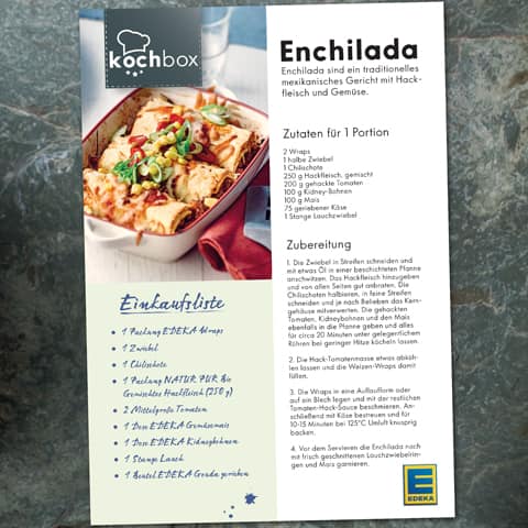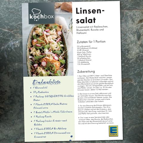 Unsere EDEKA Kochbox - Rezeptideen enthalten eine praktische Einkaufsliste. Für diese gehen wir davon aus, dass Sie (Meer-)Salz und Pfeffer sowie kleinere Mengen Zucker - für eine Prise - im Haus haben. Alle anderen Zutaten der Rezepte sind für Sie in einfacher Form in der übersichtlichen Einkaufsliste zusammengefasst. Sie können die jeweilige PDF ganz einfach ausdrucken und doppelt falten. Dann haben Sie die Einkaufsliste leicht in einer Hand und direkt auf einen Blick. Natürlich können Sie die PDF auch auf Ihrem Smartphone speichern.