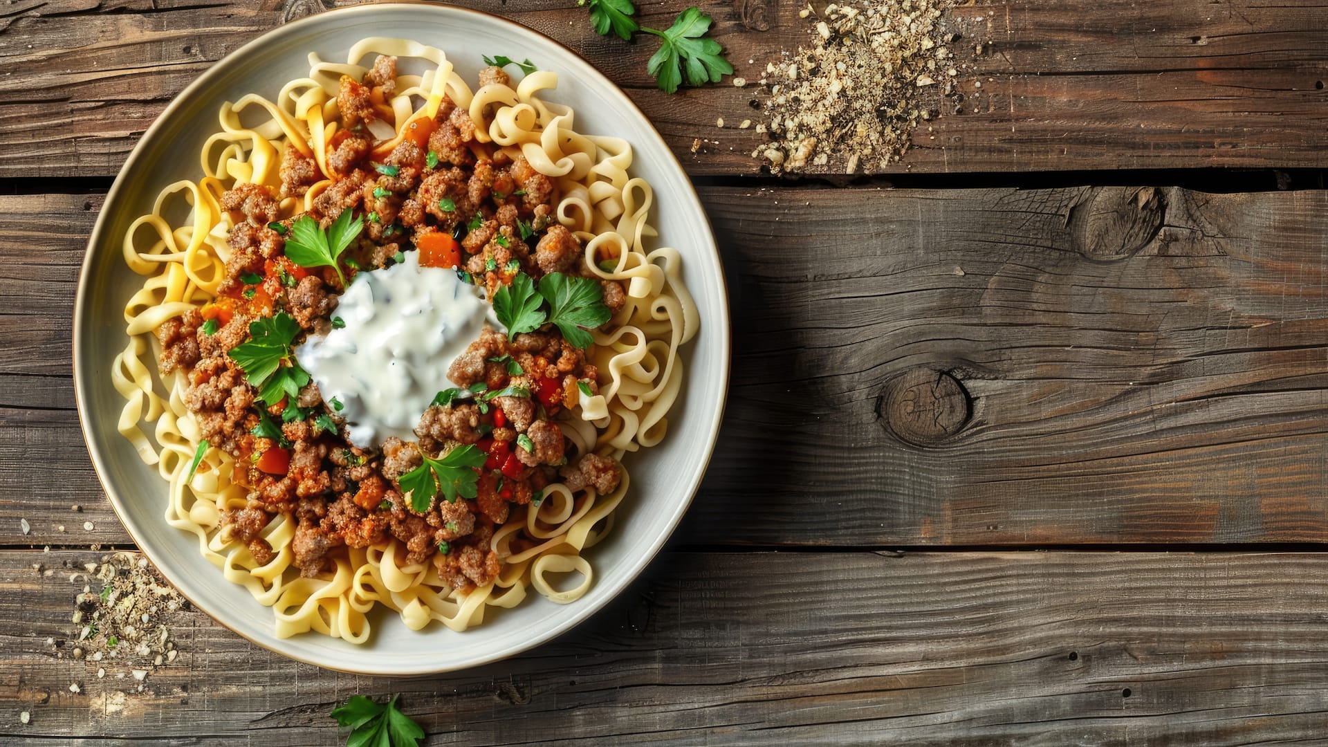 Comfort Food trifft TikTok-Trend - Herzhaftes Gericht mit Hackfleisch, Pasta und würziger Joghurt-Knoblauch-Soße.